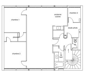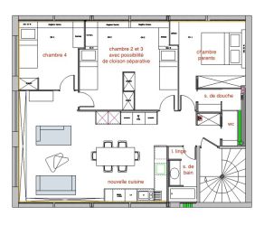Optimisation pour famille nombreuse : Création d'une chambre dans un cagibi, récupération des combles. Cuisine semi-ouverte pour une vie ensemble. Création d'une entrée et d'un wc séparé.